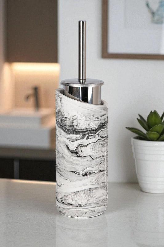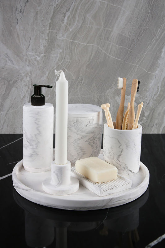 11 Parça Mermer Desenli Beton Banyo Seti | Sabunluk, Diş Fırçalık, Çöp Kovası, Klozet Fırçası
