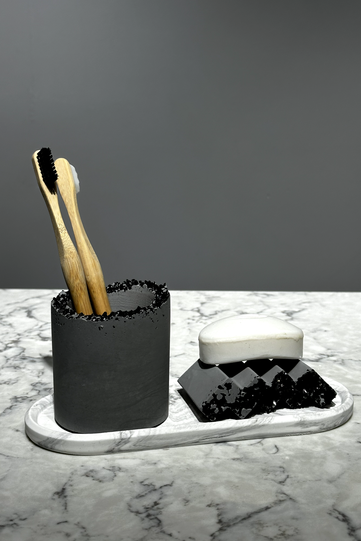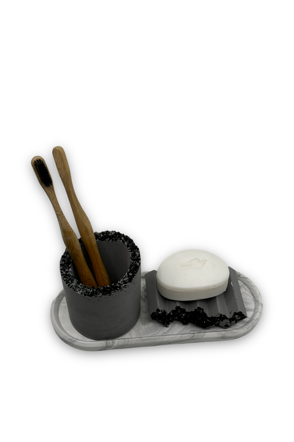 - Antrasit Diş Fırçalık ve Sabunluk 3 parça olarak tepsi, diş fırçalık ve katı sabunluk olarak gelir