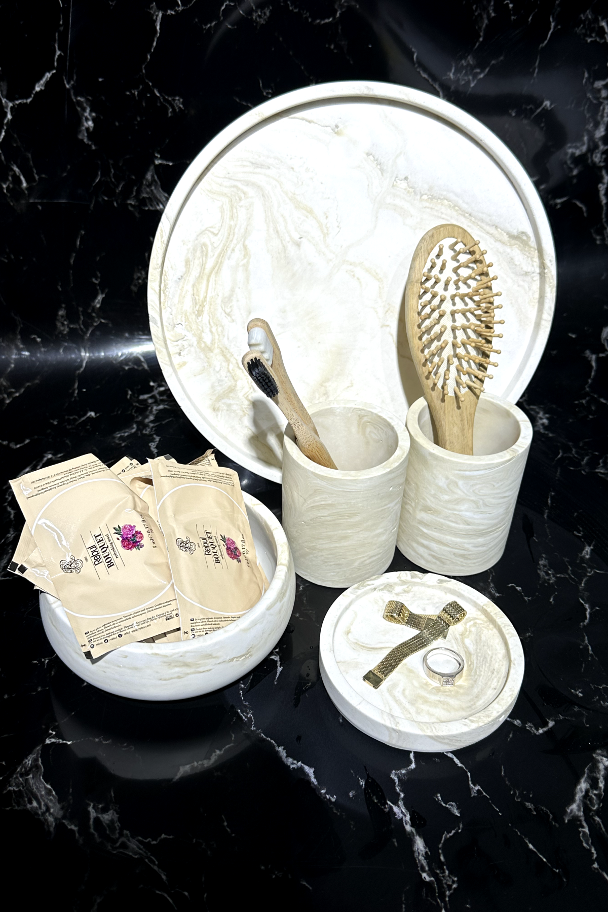 Bej Mermer Desen Beton Banyo Seti Organizer Diş Fırçalık 5 parça olarak tepsi, diş fırçalık, katı sabunluk ve havluluk olarak gelir