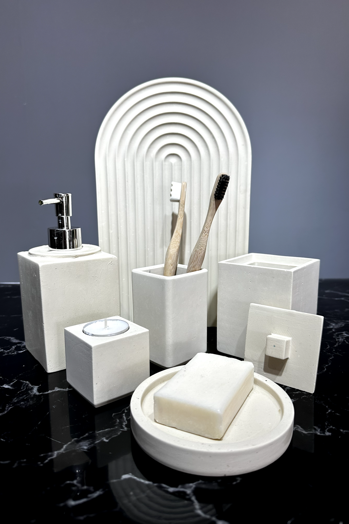 - Bej Renk Beton Banyo Seti Sıvı Sabunluk 6 parça olarak gelir