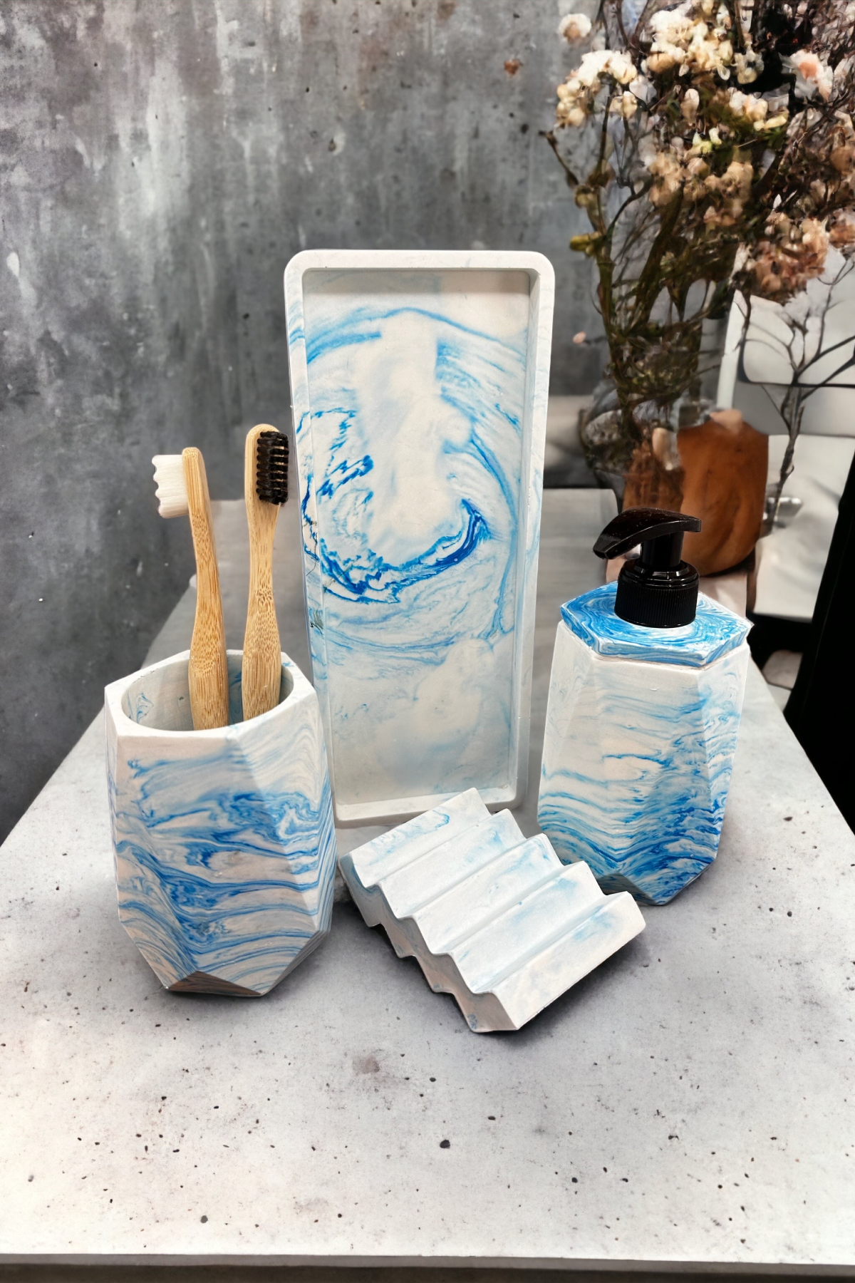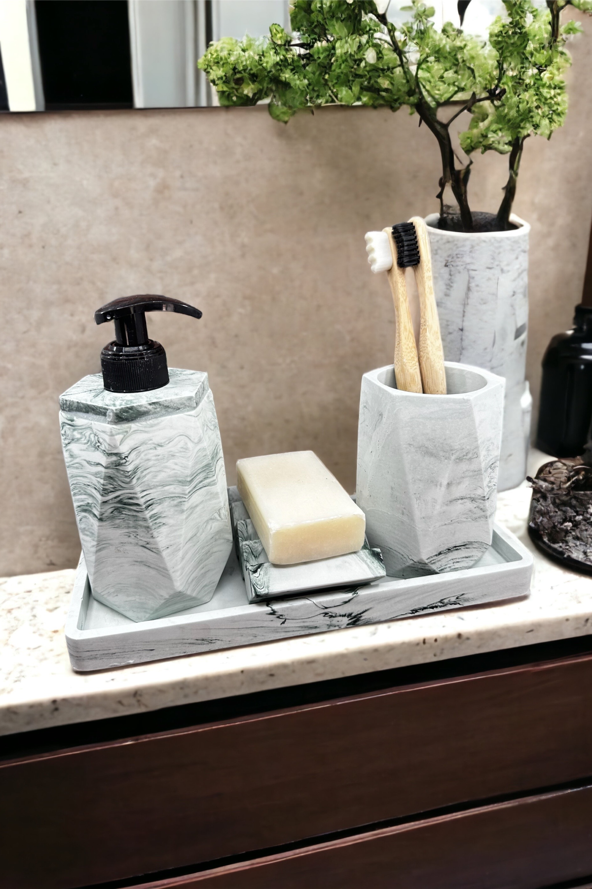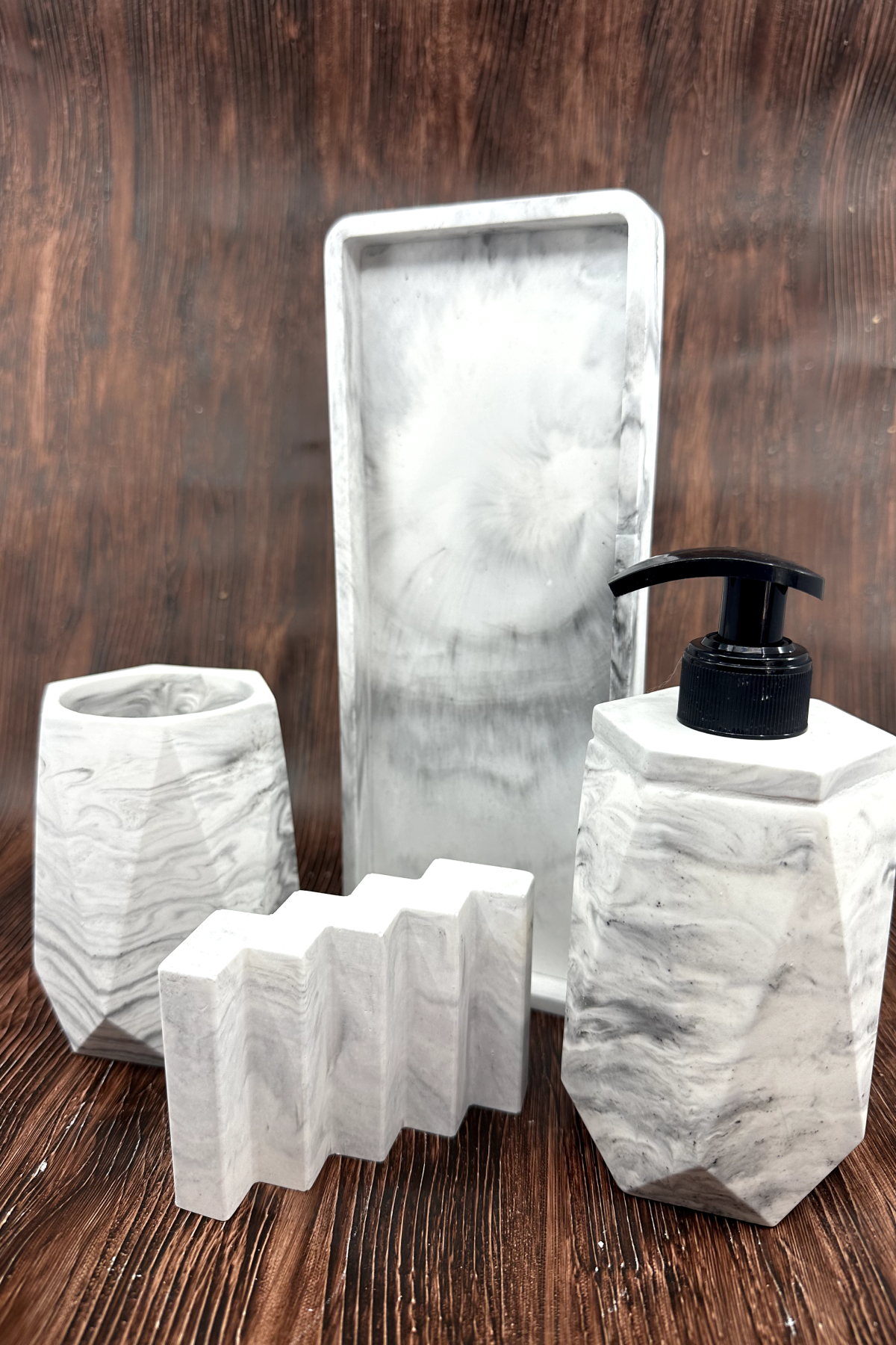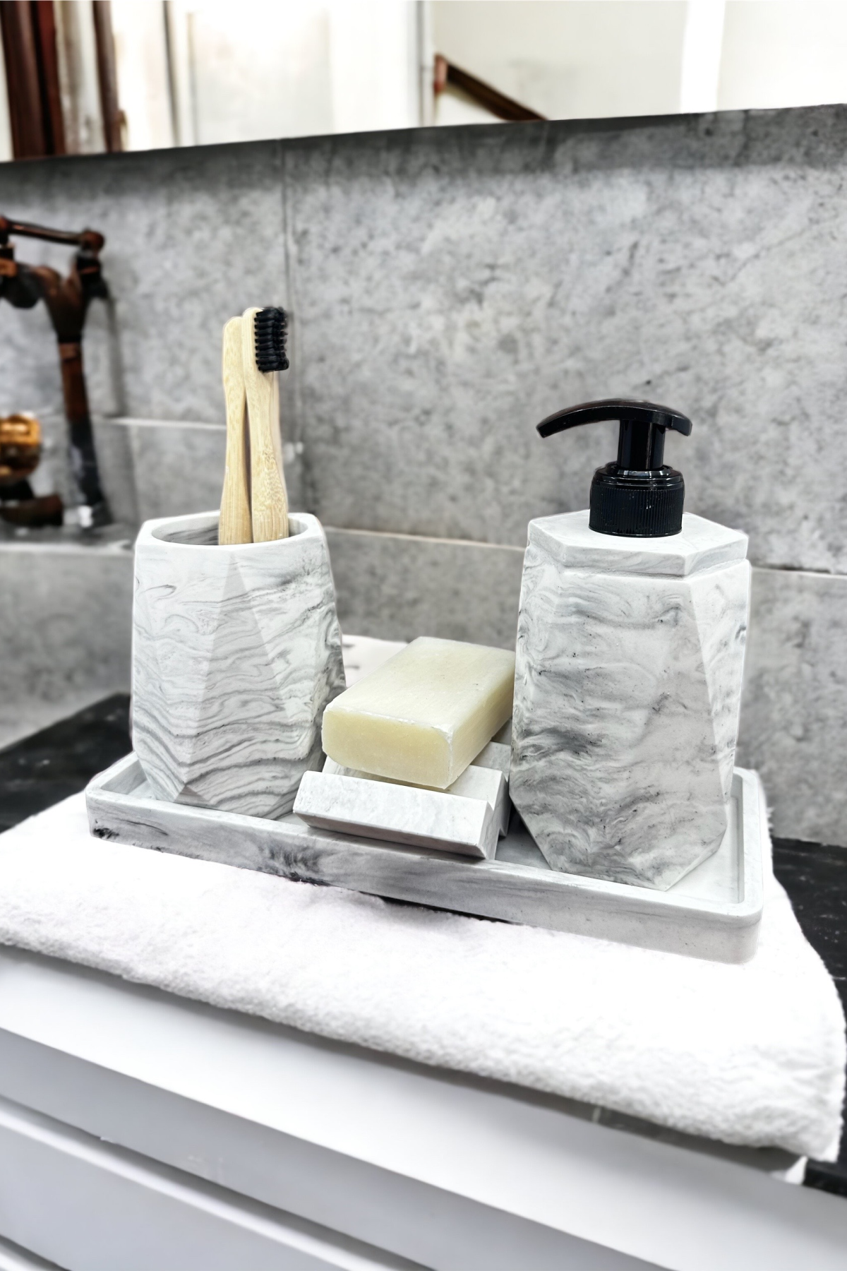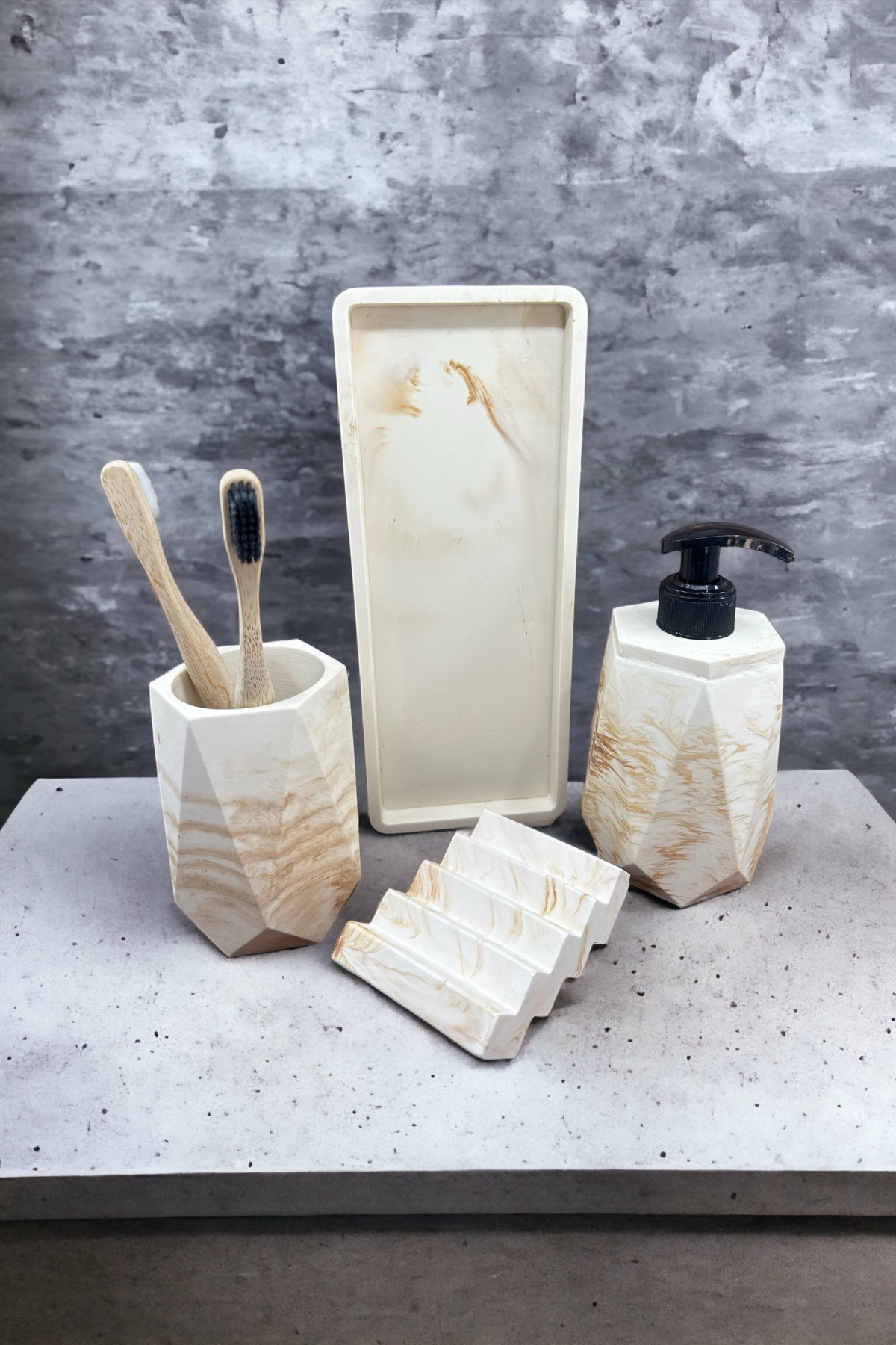 Beton Banyo Seti 4 parça olarak tepsi, diş fırçalık, sıvı sabunluk, katı sabunluk olarak gelir
