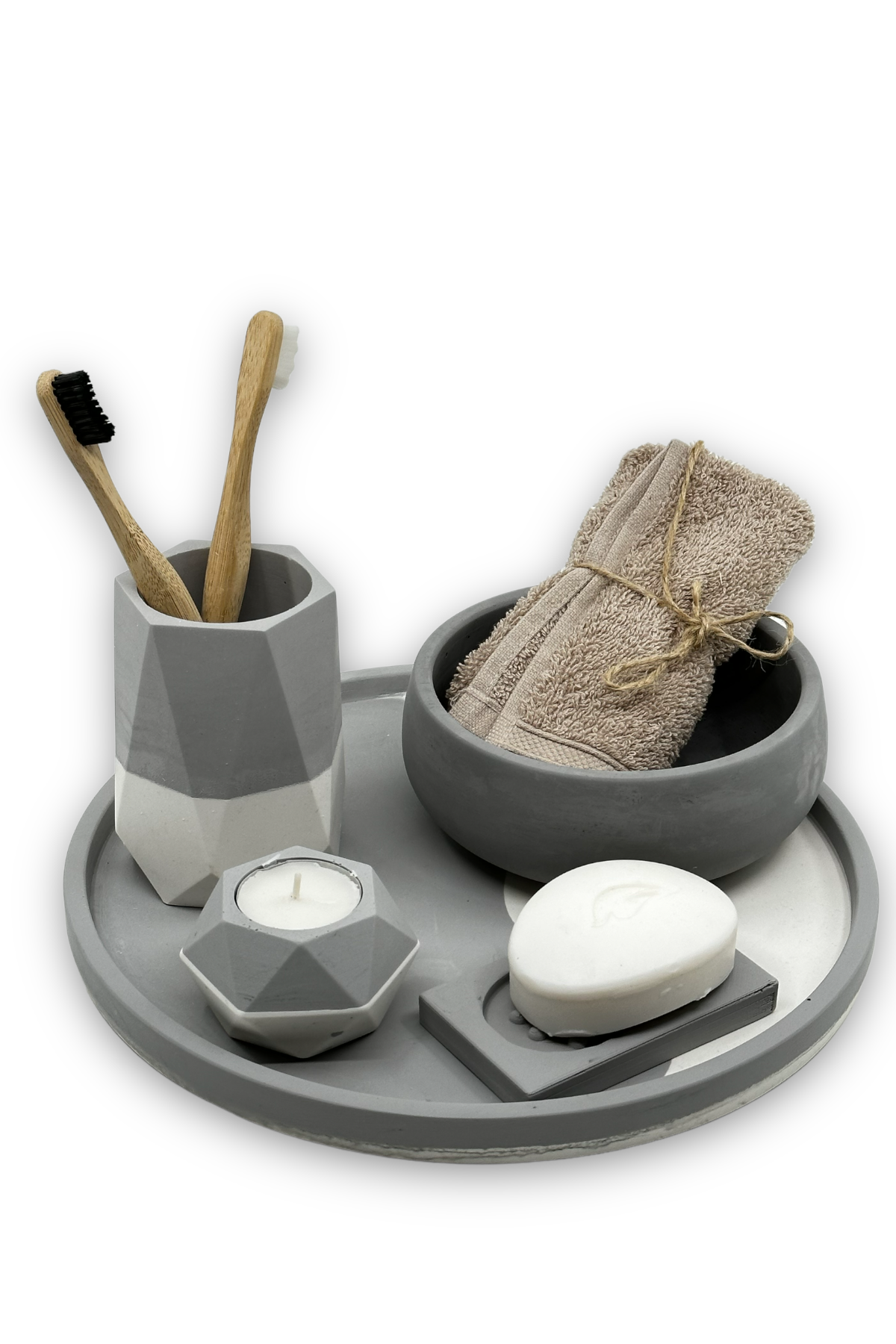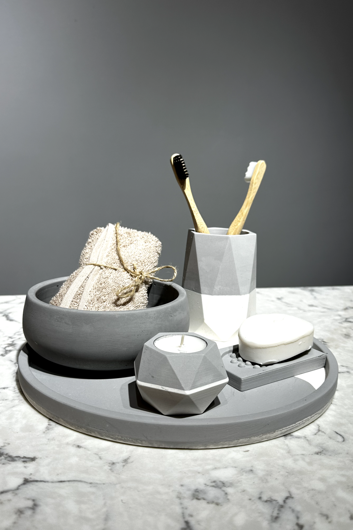 - Beyaz Antrasit Beton Banyo Seti 5 parça olarak tepsi, diş fırçalık, katı sabunluk, havluluk, mumluk olarak gelir