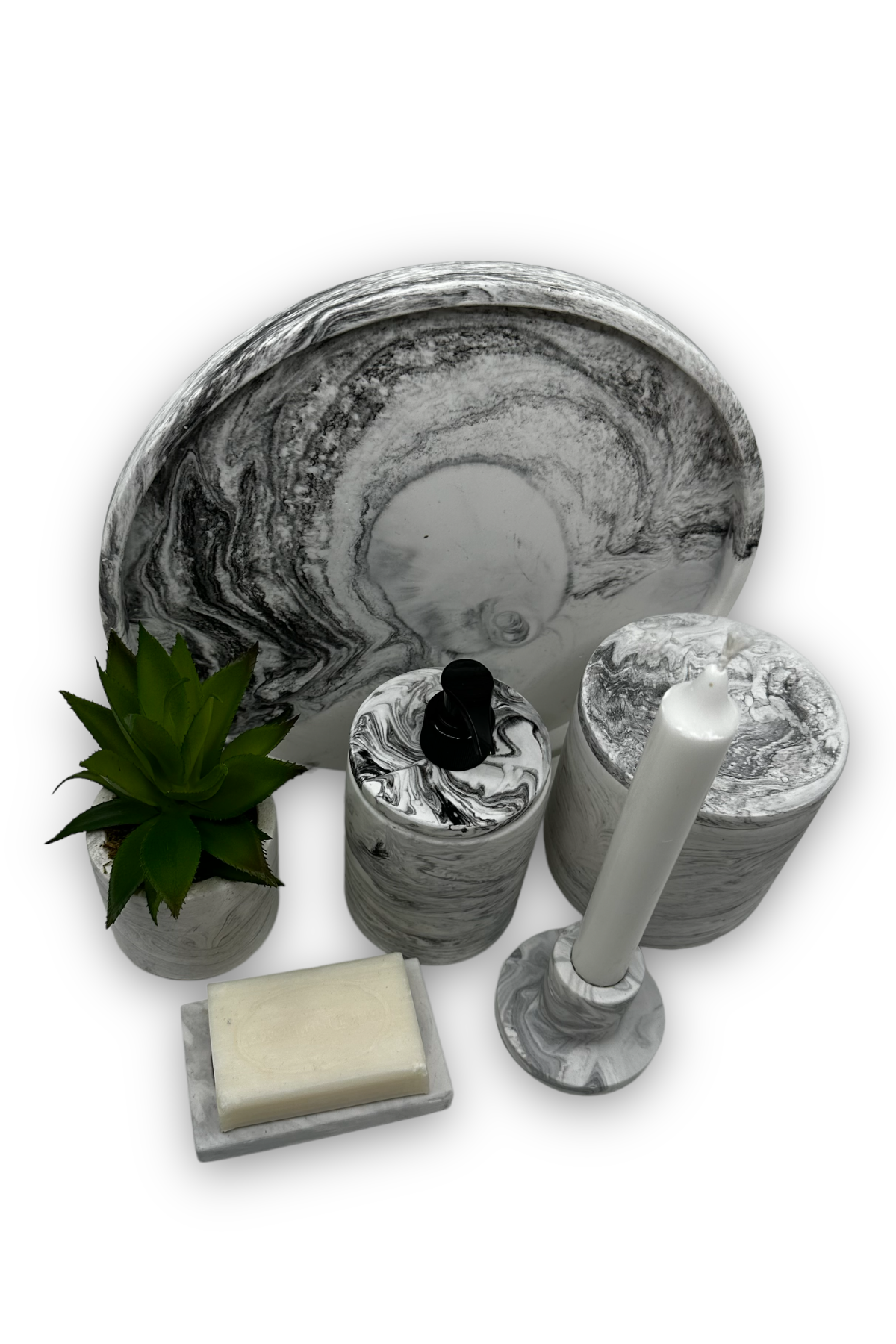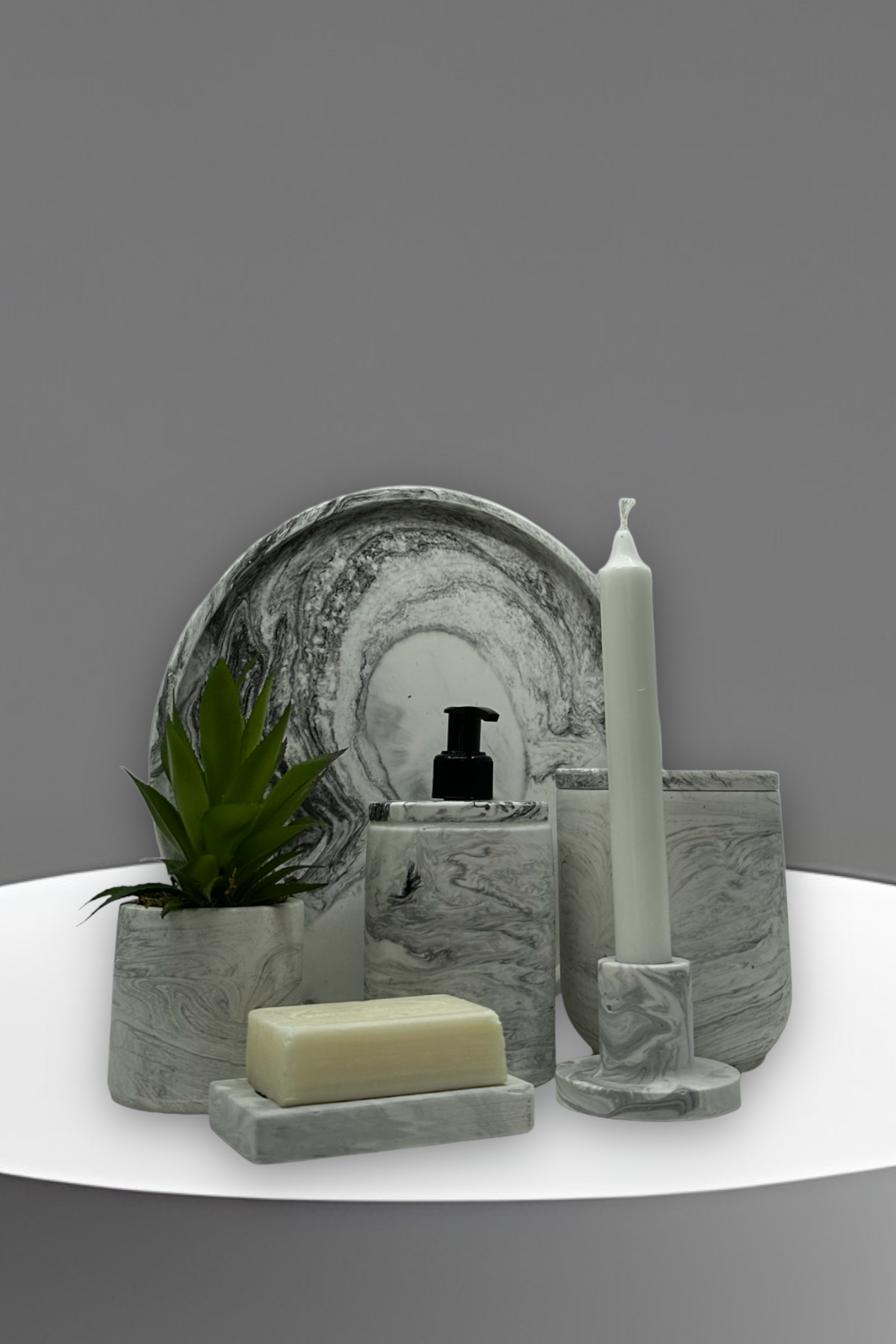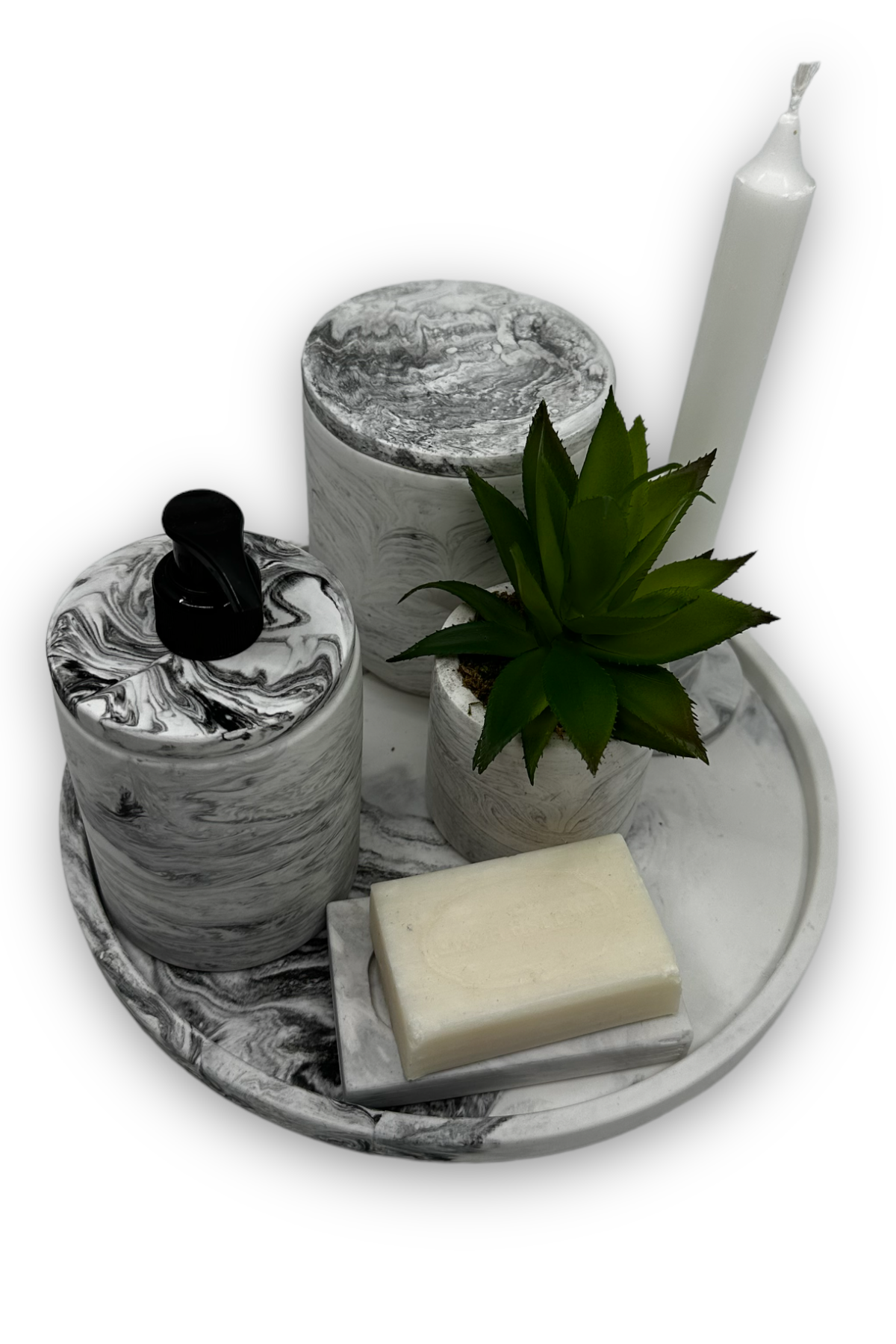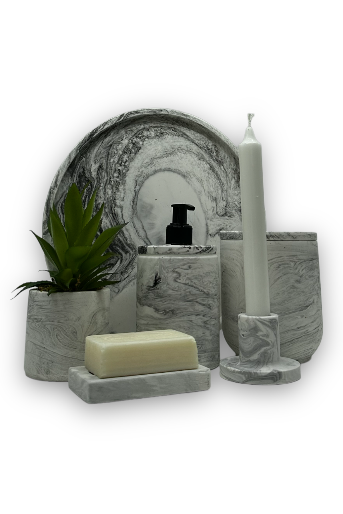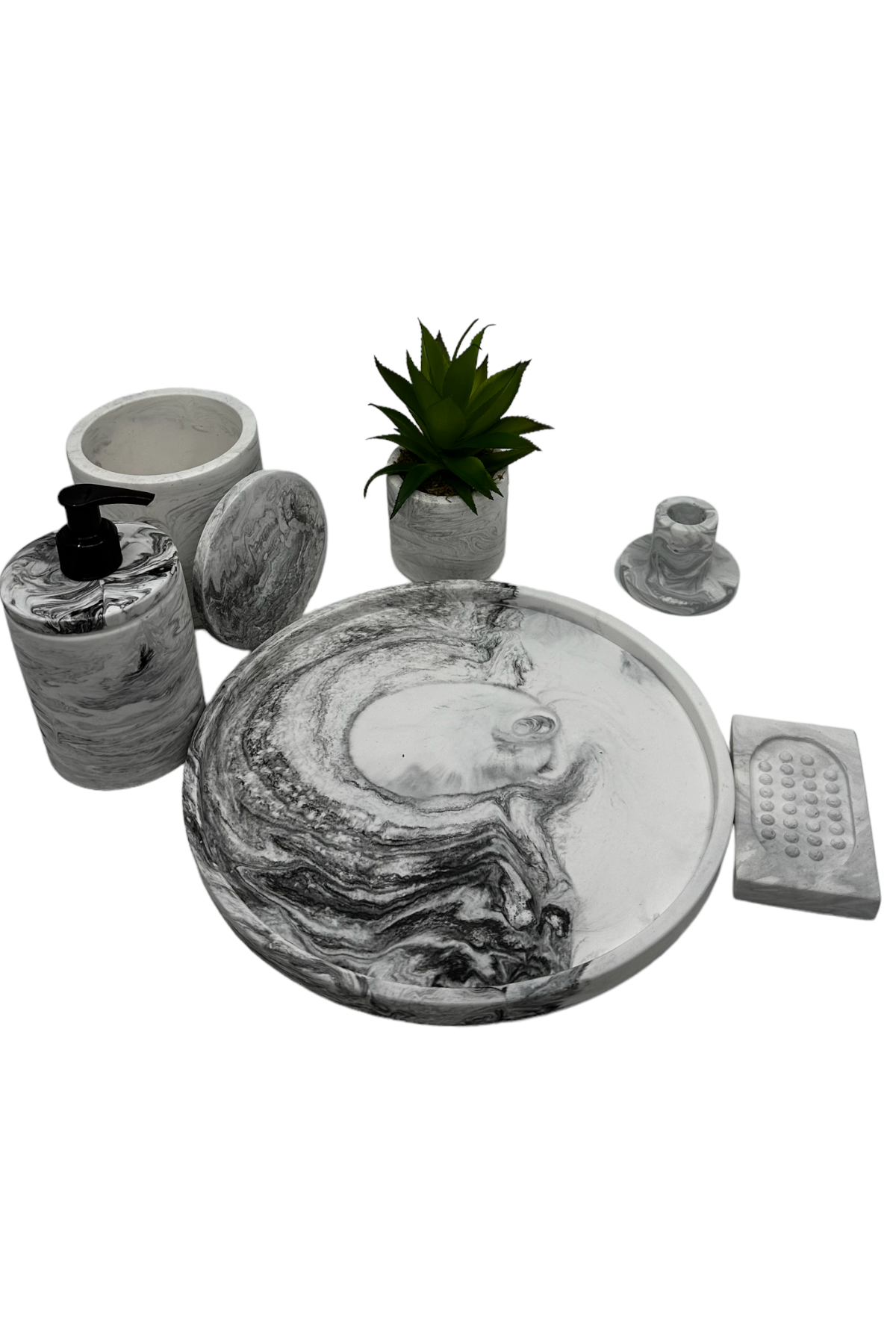 - Marble Seri Beton Banyo Seti Sıvı Sabunluk ve Yapay Sukulent 6 parça olarak tepsi, katı sabunluk, sıvı sabunluk,yapay çiçek, şamdan, kapaklı kutu olarak gelir