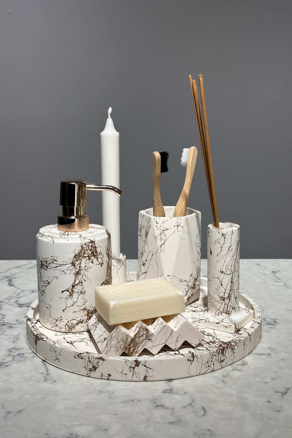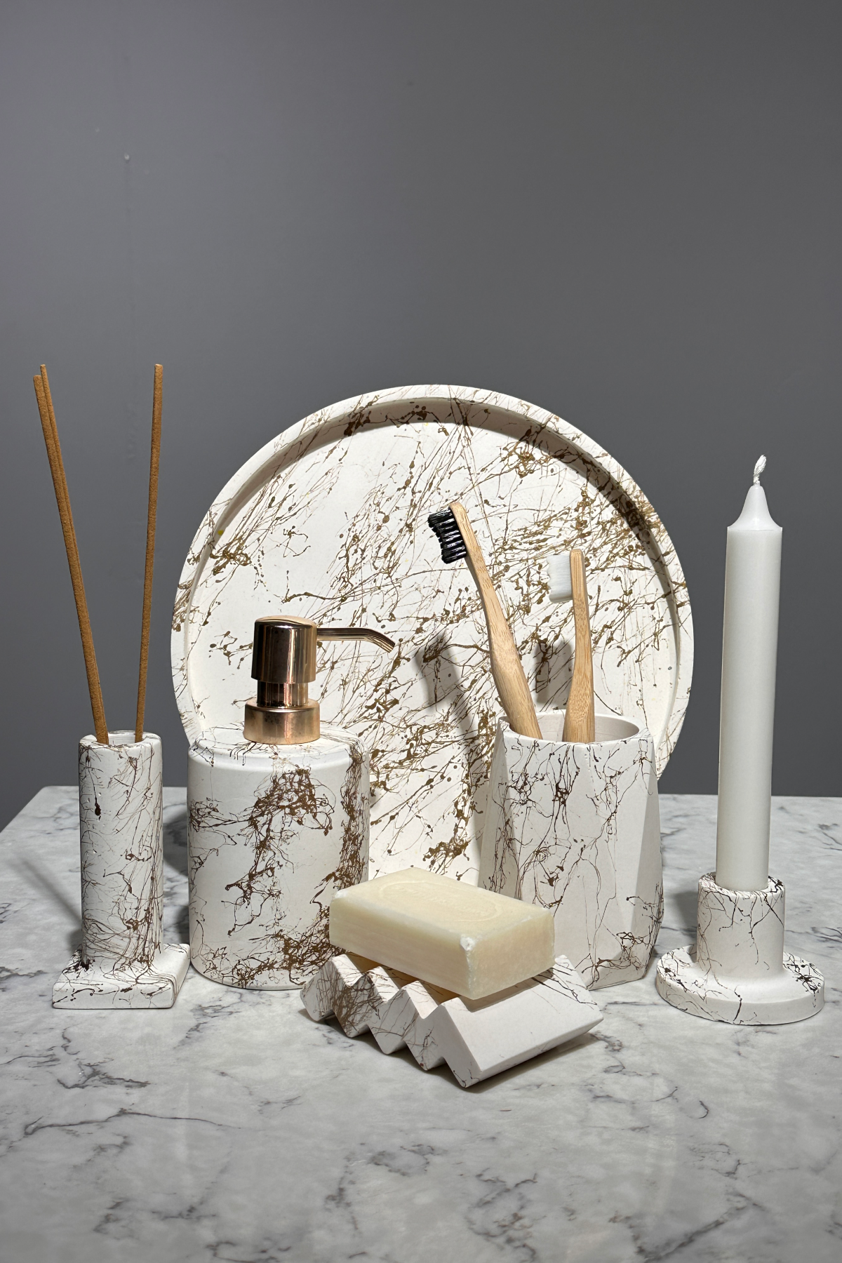 - Premium Seri Gold Detay Beton Banyo Seti 6 parça olarak tepsi, diş fırçalık, katı sabunluk , sıvı sabunluk, tütsülük ve şamdan olarak gelir