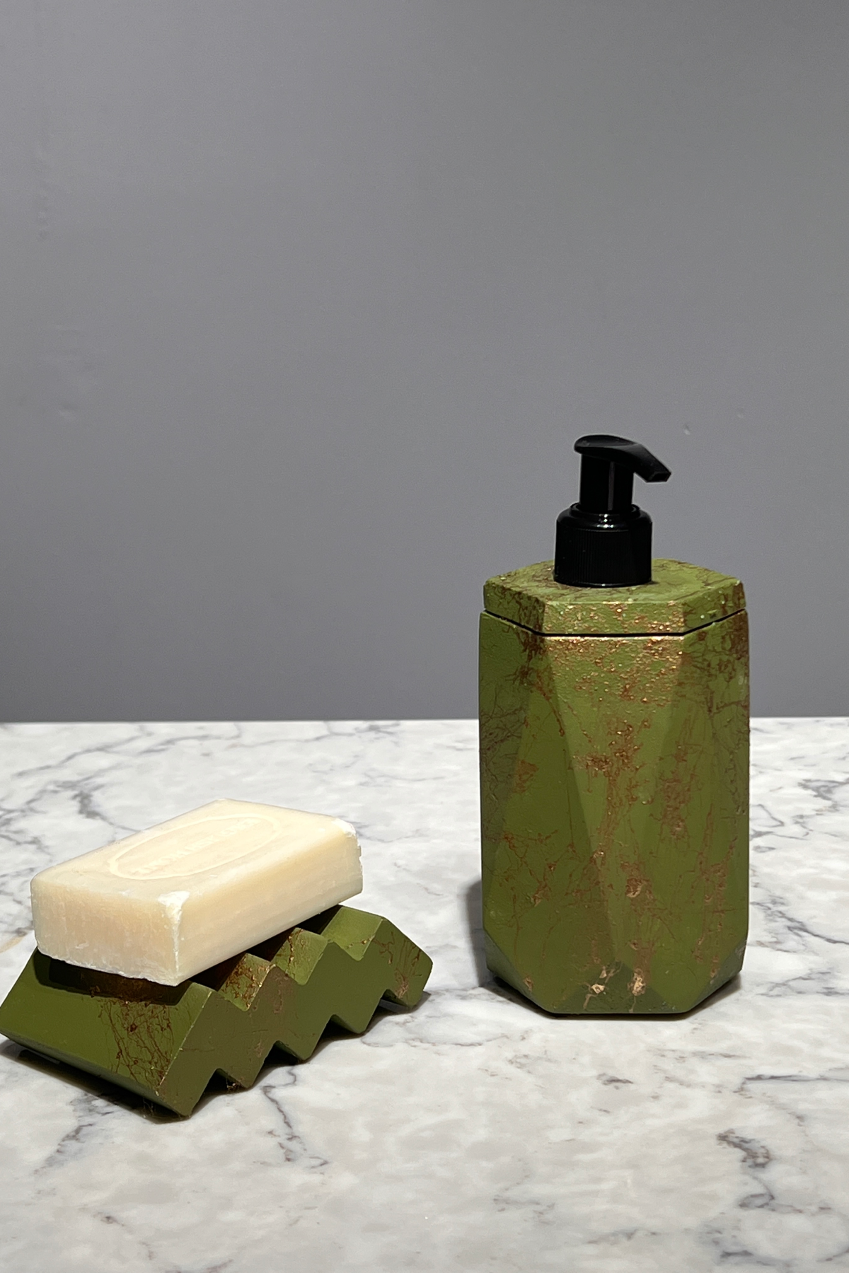 - Premium Seri Yeşil Sıvı Sabunluk Set Beton 2 parça katı sabunluk ve sıvı sabunluk olarak gelir