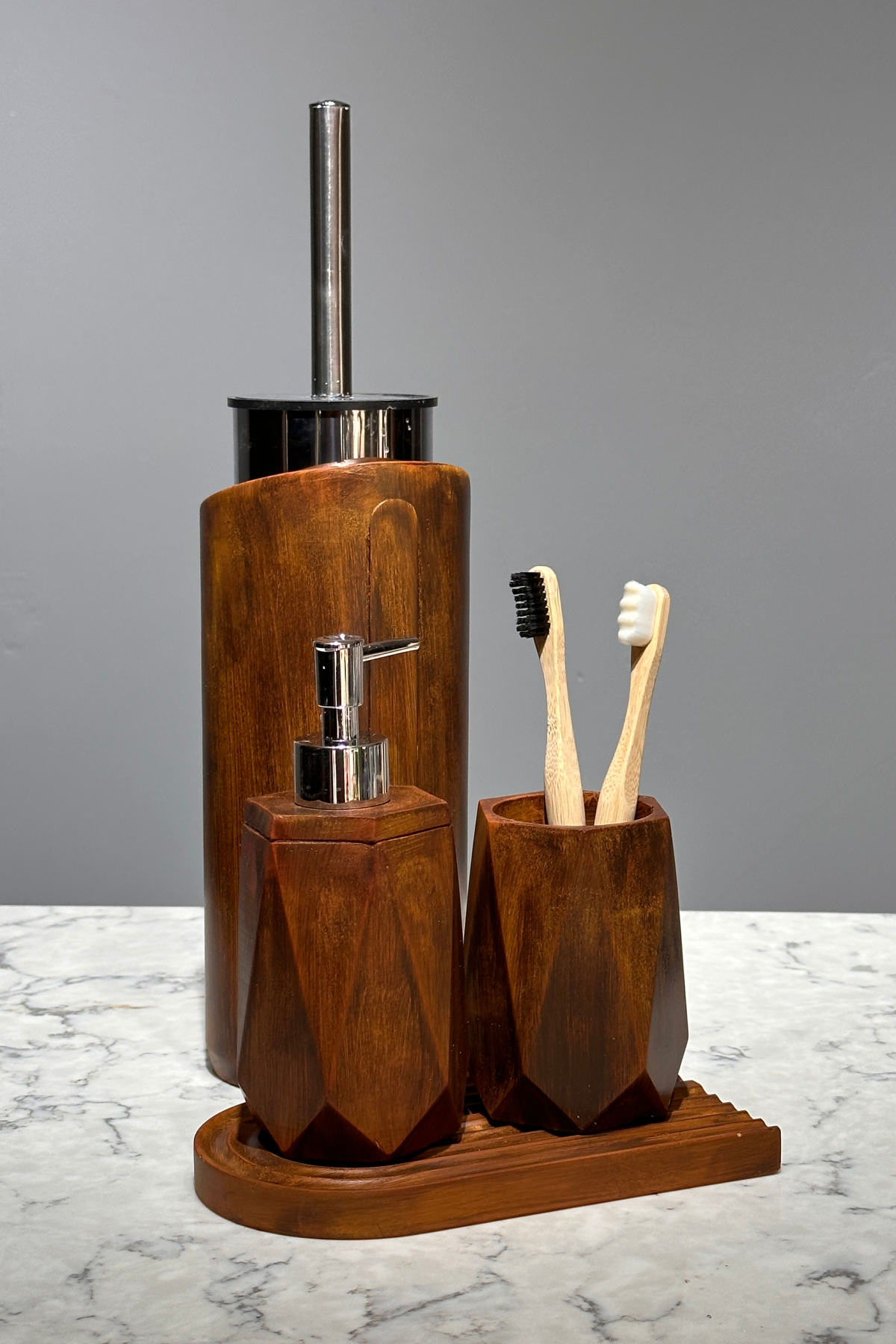 - Woodart Serisi Ahşap Görünüm Beton Banyo Seti 4 parça olarak tepsi, tuvalet fırçası, diş fırçalık, sıvı sabunluk olarak gelir