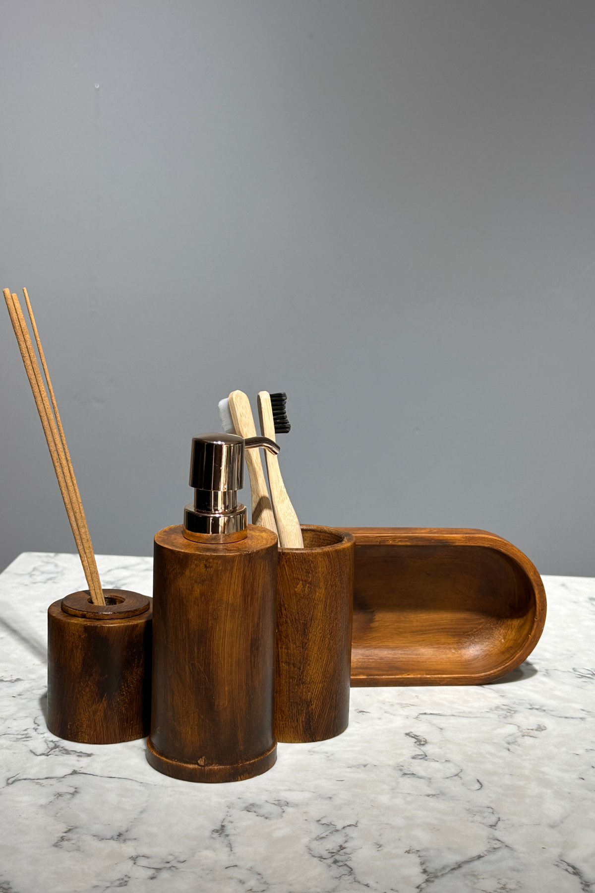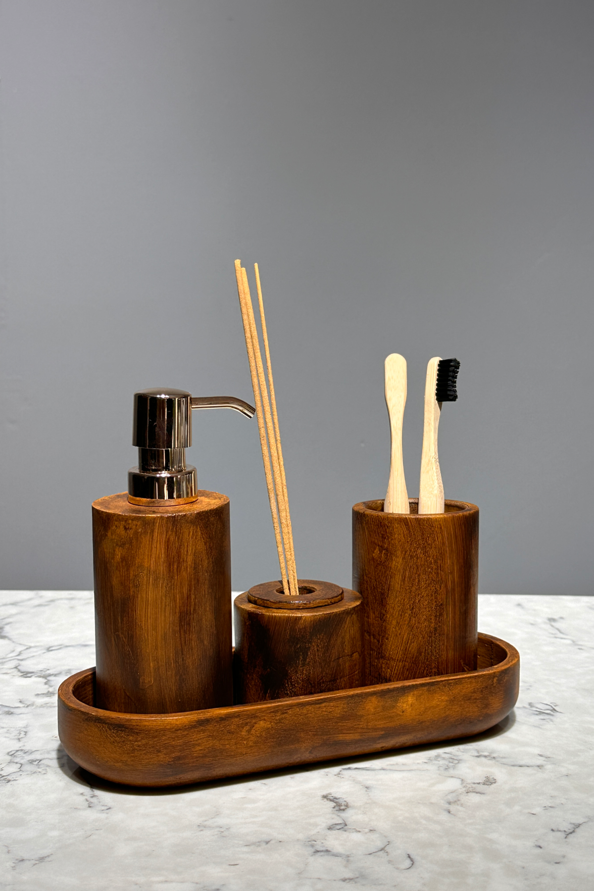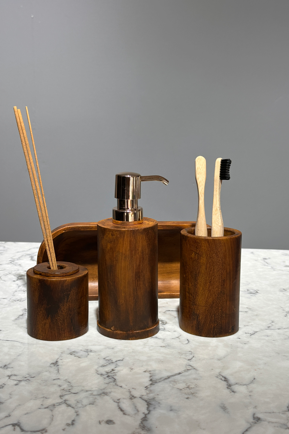 - Woodart Serisi Ahşap Görünüm Beton Diş Fırçalık Set 4 parça olarak tepsi,diş fırçalık, sıvı sabunluk ve koku tutucu olarak gelir