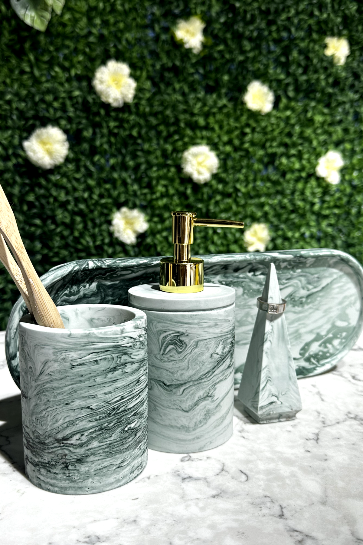 Yeşil Mermer Desen Beton Sıvı Sabunluk Diş Fırçalık Set 4 parça olarak tepsi, diş fırçalık, sıvı sabunluk ve yüzüklük olarak gelir